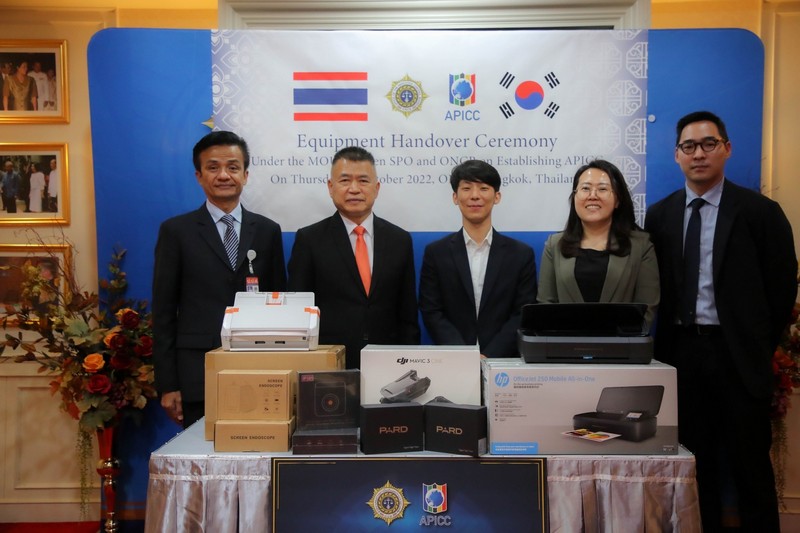 เมื่อวันพฤหัสบดีที่ 27 ตุลาคม 2565 นายวิชัย ไชยมงคล เลขาธิการคณะกรรมการป้องกันและปราบปรามยาเสพติด(เลขาธิการ ป.ป.ส.) เป็นประธานให้การต้อนรับ       นางสาวคิม โบซอง (Mr. Kim Boseong) ผู้อำนวยการส่วนยาเสพติดและองค์กรอาญชากรรม สำนักต่อต้านการทุจริตและองค์กรอาชญากรรม พร้อมด้วย                      นายพาร์ค ฮยองจุน (Mr. PARK Hyeongjum) สำนักอัยการสูงสุด (Supreme Prosecutors’ Office : SPO) สาธารณรัฐเกาหลี และนาย ฮยุน ฮันบิท(Mr. HYUN Hanbit) เจ้าหน้าที่สืบสวนสอบสวน SPO ประจำสำนักงาน ป.ป.ส. เข้าเยี่ยมคารวะ และส่งมอบอุปกรณ์สนับสนุนภารกิจการสืบสวน พร้อมหารือ และลงนามใน MOU บันทึกความเข้าใจความร่วมมือระหว่าง สำนักงานป.ป.ส. และ SPO ว่าด้วยการก่อตั้งศูนย์ข้อมูลข่าวสารและการประสานงานเพื่อการป้องกันและปราบปรามอาชญากรรมยาเสพติดแห่งภูมิภาคเอเชียและแปซิฟิก (Asia-Pacific Information & Coordination Center for Combating Drug Crimes: APICC) ณ สำนักงาน ป.ป.ส. (ดินแดง)