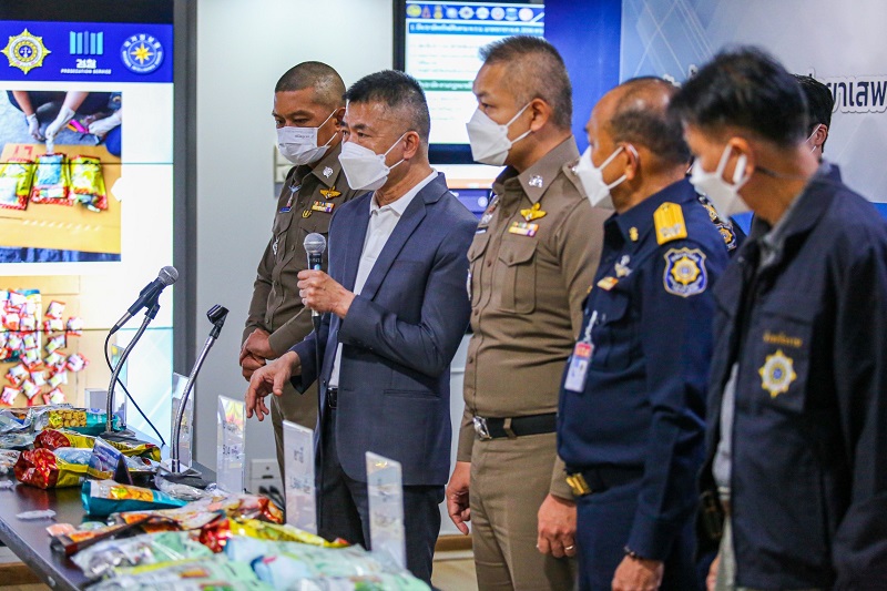 วันที่ 10 ธันวาคม 2564 นายวิชัย ไชยมงคล เลขาธิการ ..พร้อมด้วย เจ้าหน้าที่สำนักงานอัยการสูงสุดสาธารณรัฐเกาหลี (SPO)   เจ้าหน้าที่จาก the National Intelligence Service Korea เกาหลีใต้ ..ภูมิธัช  โฆษิตวนิชพงศ์ รอง ผบก..จว.นนทบุรี และ                     ..คมกฤษณ์ คำบุศย์ ผู้กำกับการสถานีตำรวจภูธรบางกรวย ร่วมแถลงข่าว “สกัดกั้นการลักลอบส่งยาเสพติดผ่านทางพัสดุไปรษณีย์ระหว่างประเทศ” ที่ซุกซ่อนอำพรางมาในบรรจุภัณฑ์อาหารเตรียมส่งออกปลายทางเกาหลีใต้ หลังเจ้าหน้าที่ ..ได้แจ้งเบาะแสผ่านสายด่วน 1386 จะมีการขนส่งพัสดุต้องสงสัยไปยังประเทศเกาหลีใต้ จึงแจ้ง สำนักงาน ..เข้าตรวจสอบ