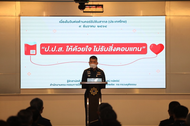 วันพฤหัสบดีที่ 9 ธันวาคม 2564 นายวิชัย ไชยมงคล เลขาธิการ ป.ป.ส. เป็นประธานในงานวันต่อต้านคอร์รัปชันสากล (ประเทศไทย) โดยมี นายธนากร คัยนันท์ รองเลขาธิการ ป.ป.ส. นายมานะ ศิริพิทยาวัฒน์ รองเลขาธิการ ป.ป.ส. ผู้บริหารสำนักงาน ป.ป.ส. และเจ้าหน้าที่สำนักงาน ป.ป.ส. ทั้งส่วนกลางและส่วนภูมิภาค โดยมีวัตถุประสงค์เพื่อแสดงเจตนารมณ์ร่วมกันในการประพฤติปฏิบัติตน ด้วยความซื่อสัตย์สุจริต ไม่กระทำการทุจริต ยึดมั่นในความยุติธรรม ยึดถือประโยชน์ส่วนรวมมากกว่าประโยชน์ส่วนตน และเจริญรอยตามเบื้องพระยุคลบาทพระบาทสมเด็จพระเจ้าอยู่หัว ด้วยจิตอาสา พร้อมทำความดี ด้วยหัวใจ ตลอดไป พร้อมกันนี้ ยังได้จัดงานให้เจ้าหน้าที่สำนักงาน ป.ป.ส. ร่วมกับบริจาคโลหิต เพื่อเป็นสาธารณกุศล และช่วยบรรเทาปัญหาการขาดแคลนโลหิต ซึ่งเป็นผลกระทบจากสถานการณ์การแพร่ระบาดโรคติดเชื้อไวรัสโคโรนา 2019 (โควิด-19) ภายในประเทศ โดยได้รับความร่วมมือจากคณะแพทย์ พยาบาล และเจ้าหน้าที่ โรงพยาบาลราชวิถี มาออกหน่วยเคลื่อนที่รับบริจาคโลหิต ณ ห้องประชุมชิดชัย วรรณสถิตย์ อาคาร 2 ชั้น 3 สำนักงาน ป.ป.ส.และผ่านระบบ webex