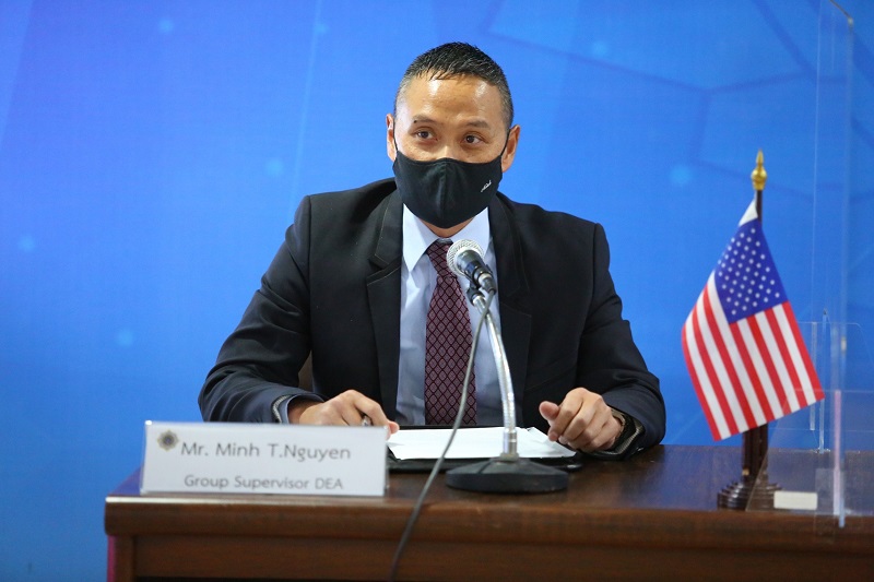 ส่วน นาย มิน ที นูเวน  (Mr. Minh T. Nguyen) หัวหน้ากลุ่มสืบสวน สำนักงานปราบปรามยาเสพติด สหรัฐอเมริกาประจำภูมิภาคตะวันออกไกล กล่าวว่า DEA ทำงานร่วมกับทางการไทยมาอย่างยาวนานมาตั้งแต่ .. 1963 ซึ่งนั่นเป็นเวลาถึง 10 ปีก่อนที่ DEA จะก่อตั้งอย่างเป็นทางการ ซึ่งประเทศไทยถือว่ามีความโดดเด่นและมีความร่วมมือในระดับที่ดีมาก ทั้งนี้การร่วมมือดังกล่าวเป็นประโยชน์อย่างมากต่อประเทศเพื่อนบ้านและประเทศอื่นๆ อันที่จริงแล้วเราทำงานร่วมกับ สำนักงาน ..ทุกวัน โดยเรายังส่งเจ้าหน้าที่ ผู้เชี่ยวชาญการสืบสวนสอบสวนด้านการเงิน มาประจำที่สำนักงาน ..เพื่อส่งเสริมงานสืบสวนร่วมกัน นั่นเพราะว่าองค์กรอาชญากรรม นั้นเรามีความจำเป็นต้องทำงานร่วมกันเพื่อจัดการปัญหาดังกล่าว เช่นเดียวกันกับการสกัดกั้นสารตั้งต้นก่อนที่จะเข้าไปสู่แหล่งผลิต เพราะหากไม่มีสารตั้งต้นก็ไม่สามารถผลิตยาเสพติดได้ DEA  ยังให้ความสำคัญกับการจัดการการดำเนินการที่เกี่ยวข้องกับการฟอกเงิน ซึ่งเราได้ร่วมกับ สำนักงาน ..เสมอมา โอกาสนี้ขอขอบคุณเลขาธิการ ..ที่ให้โอกาส DEA ได้พูดถึงความร่วมมือที่เราทำงานร่วมกัน