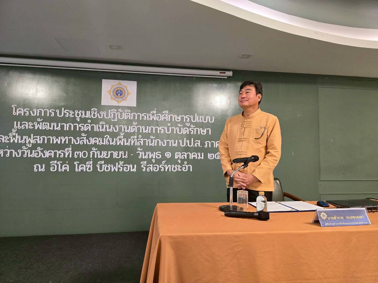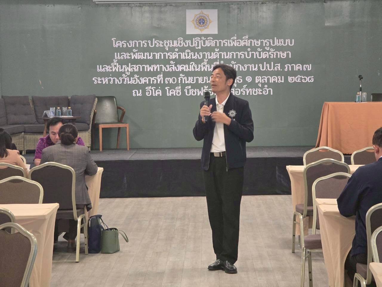 สำนักงาน ปปส.ภาค 7 โดย ส่วนประสานพื้นที่ จัดโครงการประชุมเชิงปฏิบัติการเพื่อพัฒนาการดำเนินงานด้านการบำบัดรักษาและฟื้นฟูสภาพทางสังคมในพื้นที่สำนักงาน ปปส.ภาค 7 ระหว่างวันที่ 30 กันยายน – 1 ตุลาคม 2568 ณ โรงแรม อีโค่ โคซี่ บีชฟร้อน รีสอร์ท ชะอำ ตำบลบางเก่า อำเภอชะอำ จังหวัดเพชรบุรี โดยมีนายสำรวย วรเตชะคงคา ผู้เชี่ยวชาญด้านการป้องกันและปราบปรามยาเสพติด ภาค 7 เป็นประธานในพิธีเปิด และบรรยายพิเศษในหัวข้อ กรอบและแนวทางการทบทวนการดำเนินงานด้านบำบัดรักษาและฟื้นฟูสภาพทางสังคมเพื่อสรุปบทเรียนเป็นแนวทางในการดำเนินงานในปีงบประมาณ พ.ศ. 2569 และนายนพรัตน์ ไวอัมภา ผู้อำนวยการส่วนประสานพื้นที่เป็นผู้กล่าวรายงาน วัตถุประสงค์ของการจัดโครงการ การจัดโครงการในครั้งนี้มีกลุ่มเป้าหมายจำนวนทั้งสิ้น 75 นาย ประกอบไปด้วยหน่วยงานที่เกี่ยวข้องในกระบวนการบำบัดรักษาและฟื้นฟูสภาพทางสังคมในพื้นที่สำนักงาน ปปส.ภาค 7 ทั้ง 8 จังหวัด วิทยากร อาจารย์ อิสระ โดยมีวัตถุประสงค์ในการจัดโครงการ ดังนี้