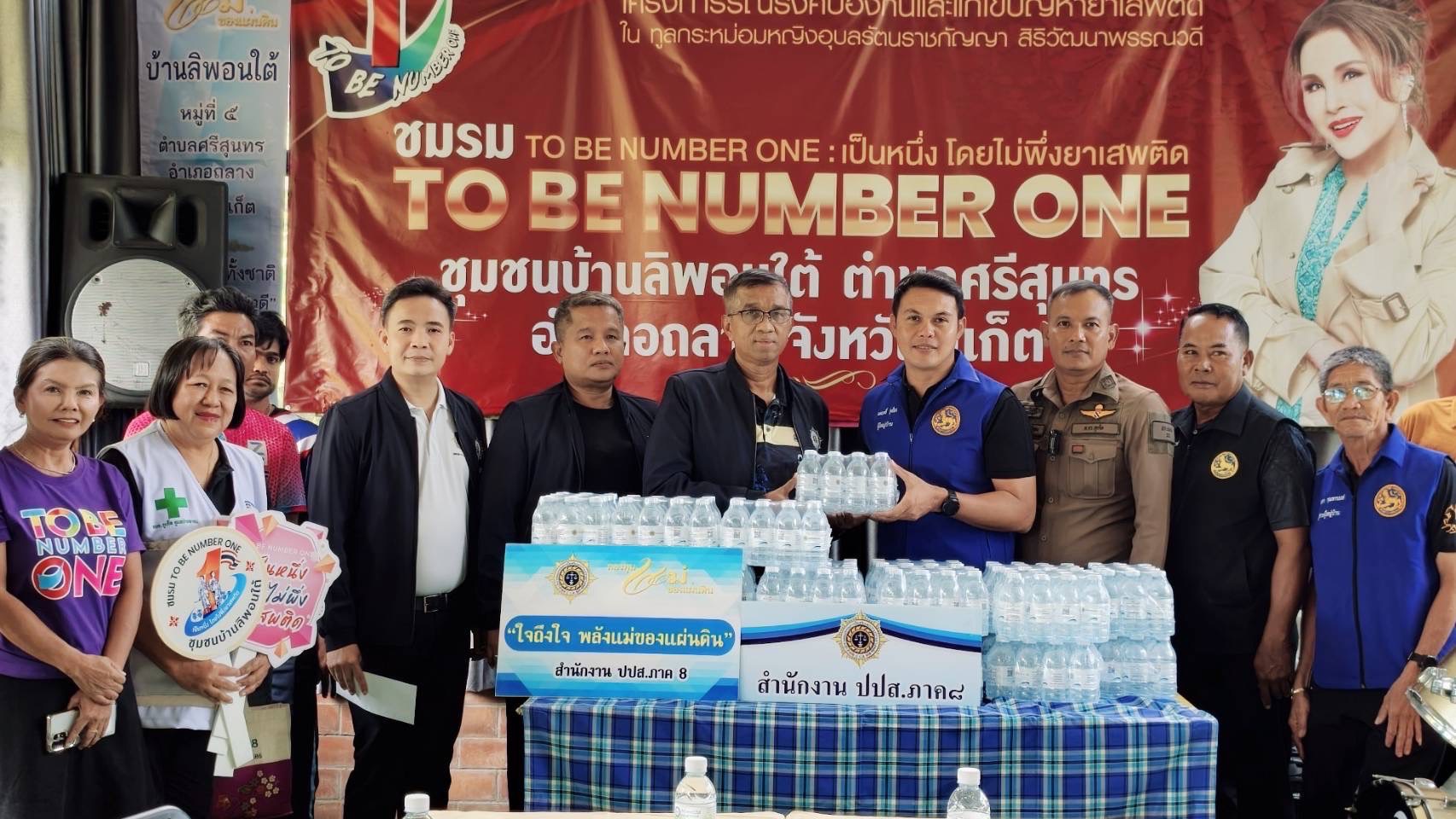 ทั้งนี้ ผอ.ปปส.ภ.8 มอบกระเช้าเครื่องอุปโภค บริโภค และน้ำดื่มจาก สำนักงาน ปปส. ภาค 8 ให้แก่ผู้ผ่านการบำบัดรักษายาเสพติด ทั้ง 2 ราย รวมถึงมอบสื่อรณรงค์ประชาสัมพันธ์ จากสำนักงาน ปปส. ภาค 8 ให้ นายนพฤทธิ์ รุ่งเรือง ผู้ใหญ่บ้าน ม.5 บ้านลิพอนใต้ ต.ศรีสุนทร อ.ถลาง จังหวัดภูเก็ต ประธานคณะกรรมการกองทุนแม่บ้านลิพอนใต้ เพื่อใช้ในการดำเนินกิจกรรมด้านการป้องกันแก้ไขปัญหายาเสพติดในพื้นที่ และกิจกรรม To be Number One ในพื้นที่ พร้อมทั้ง มอบเช็คเงินอุดหนุนสนับสนุนการดำเนินกิจกรรมป้องกันและแก้ไขปัญหายาเสพติดในพื้นที่ โครงการกีฬากองทุนแม่ต้านยาเสพติดบ้านท่าฉัตรไชย ตำบลไม้ขาว อำเภอถลาง จังหวัดภูเก็ต ปี 2569 ให้แก่ นายภานุพันธ์ จินดาพล ผู้ใหญ่บ้านหมู่ 5 บ้านท่าฉัตรไชย ตำบลไม้ขาว อำเภอถลาง จังหวัดภูเก็ต ในการดำเนินกิจกรรมป้องกันและแก้ไขปัญหายาเสพติดในพื้นที่