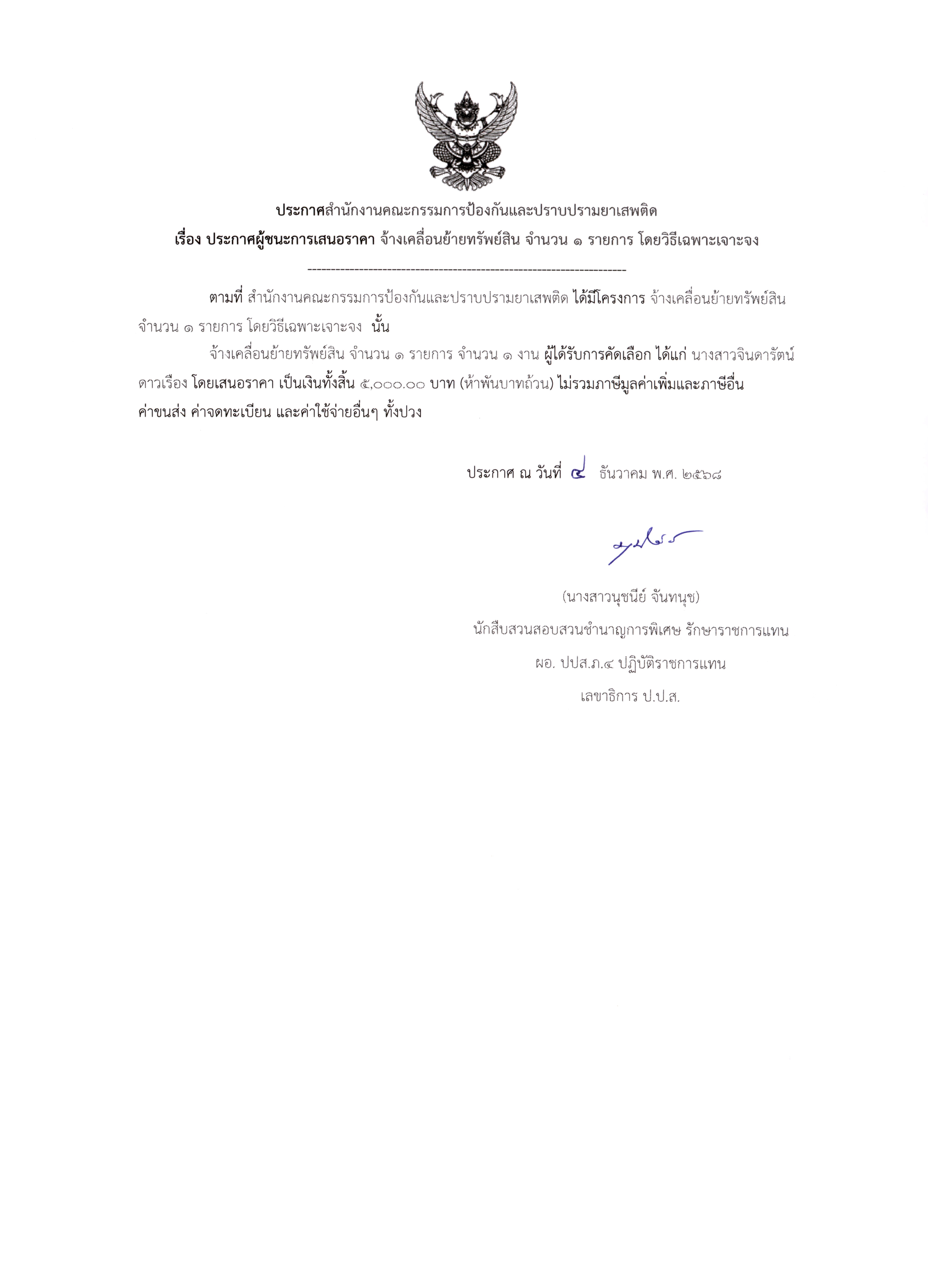 ปปส.ภ.๔ ประกาศผู้ชนะการเสนอราคา จ้างเคลื่อนย้ายทรัพย์สิน จำนวน ๑ รายการ โดยวิธีเฉพาะเจาะจง