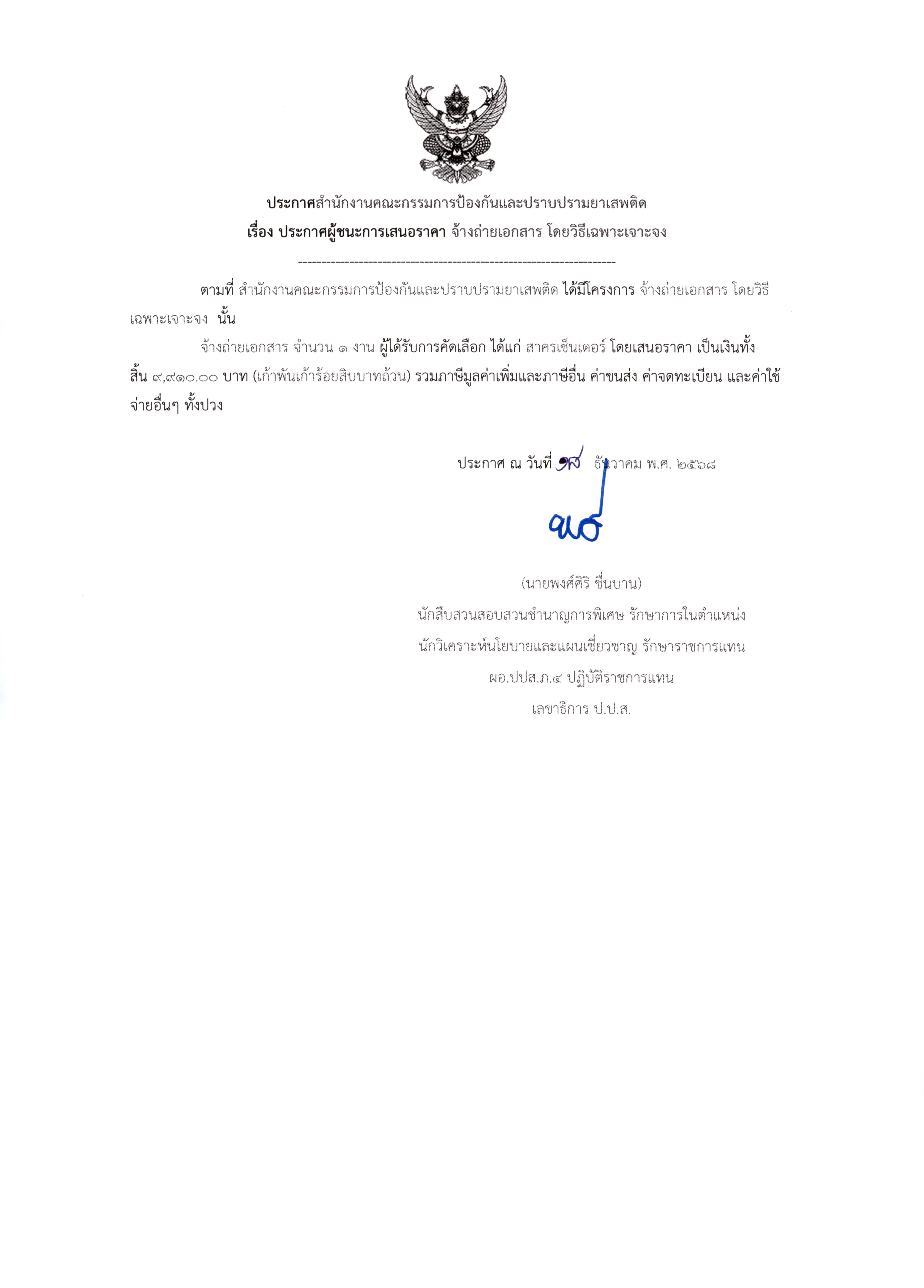 ปปส.ภ.๔ ประกาศผู้ชนะการเสนอราคา จ้างถ่ายเอกสาร โดยวิธีเฉพาะเจาะจง