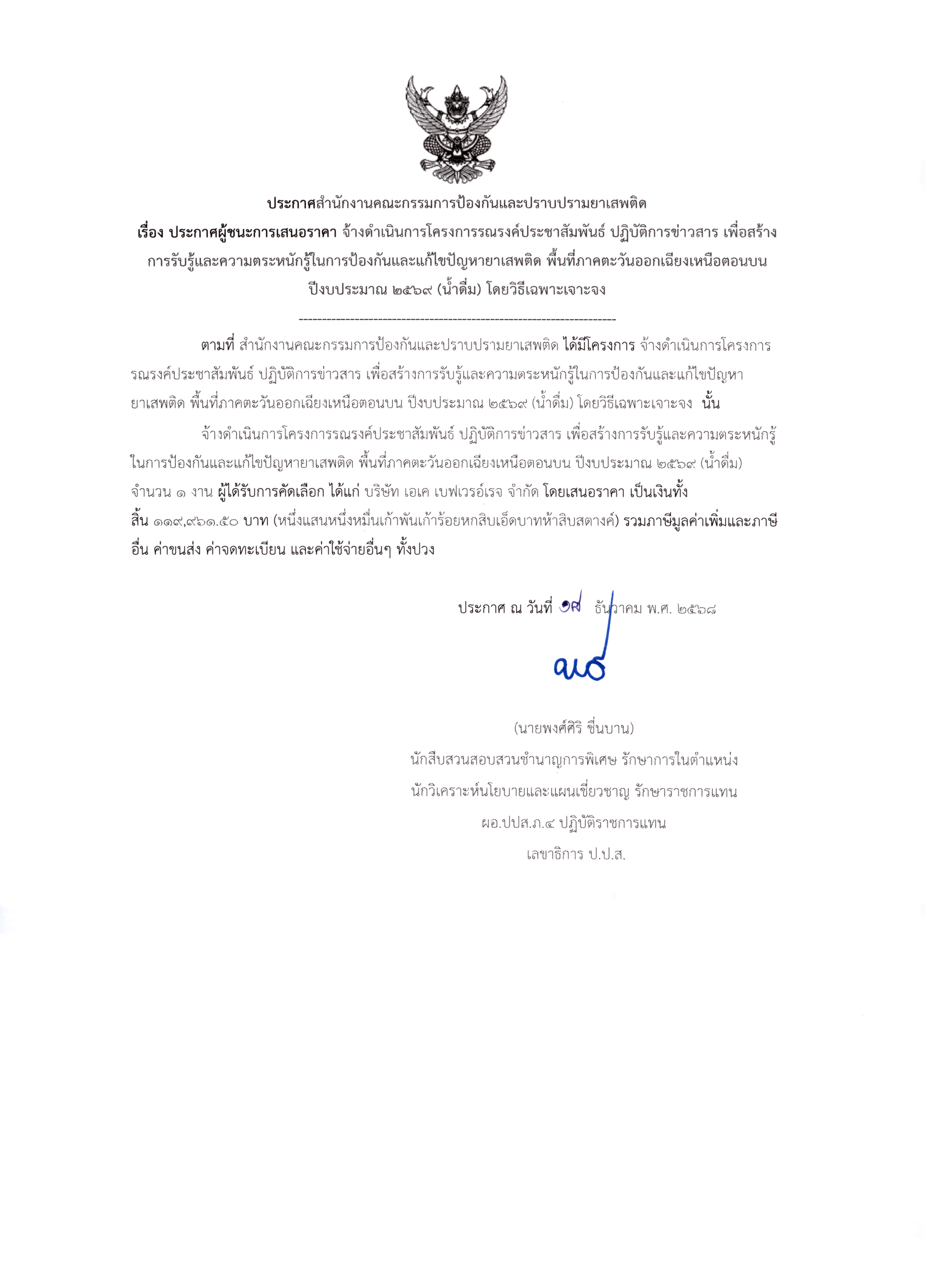 ปปส.ภ.๔ ประกาศผู้ชนะการเสนอราคา จ้างดำเนินการโครงการรณรงค์ประชาสัมพันธ์ ปฏิบัติการข่าวสาร เพื่อสร้างการรับรู้และความตระหนักรู้ในการป้องกันและแก้ไขปัญหายาเสพติด พื้นที่ภาคตะวันออกเฉียงเหนือตอนบน ปีงบประมาณ ๒๕๖๙ (น้ำดื่ม) โดยวิธีเฉพาะเจาะจง