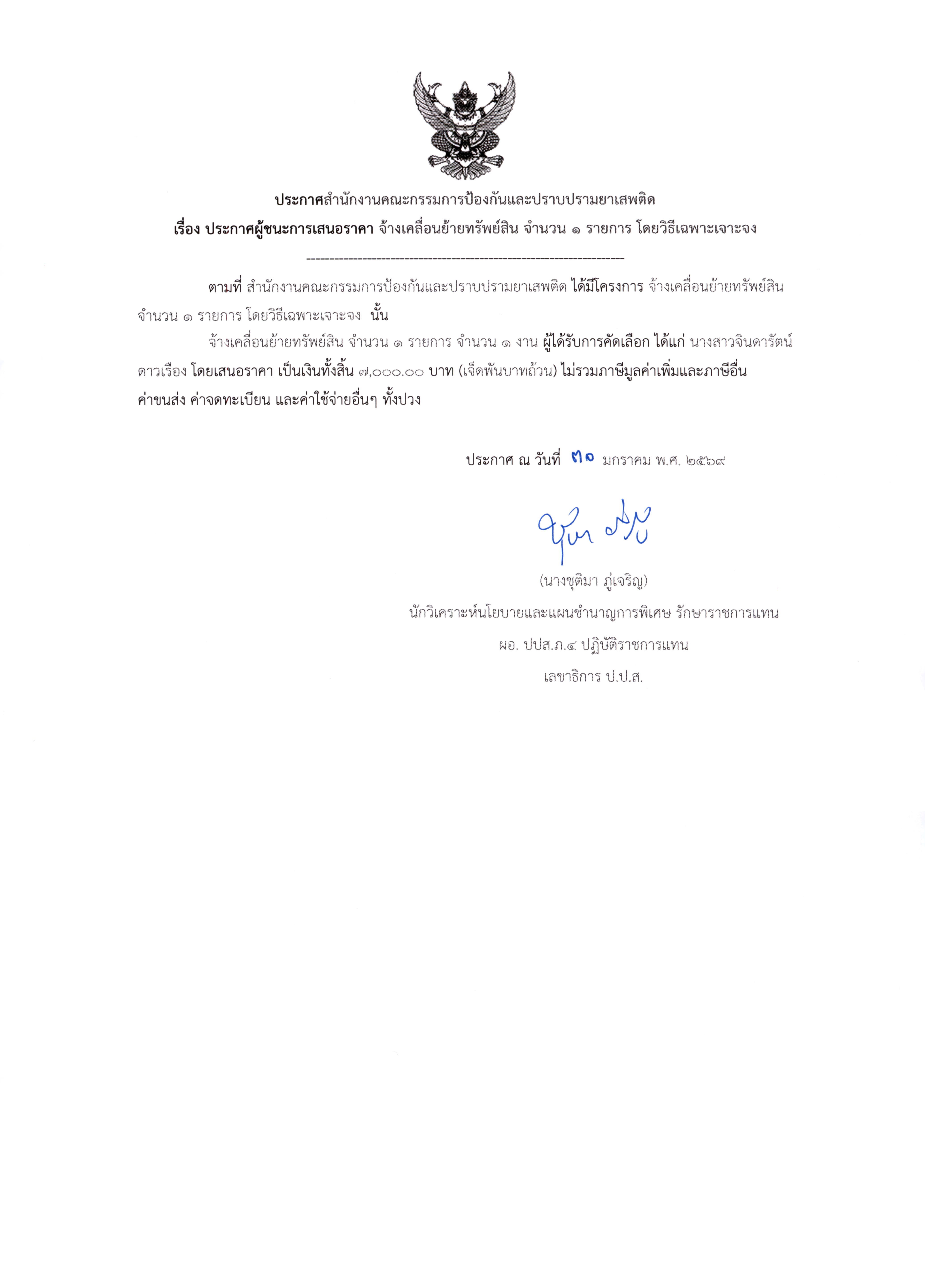 ปปส.ภ.๔ ประกาศผู้ชนะการเสนอราคา จ้างเคลื่อนย้ายทรัพย์สิน จำนวน ๑ รายการ โดยวิธีเฉพาะเจาะจง