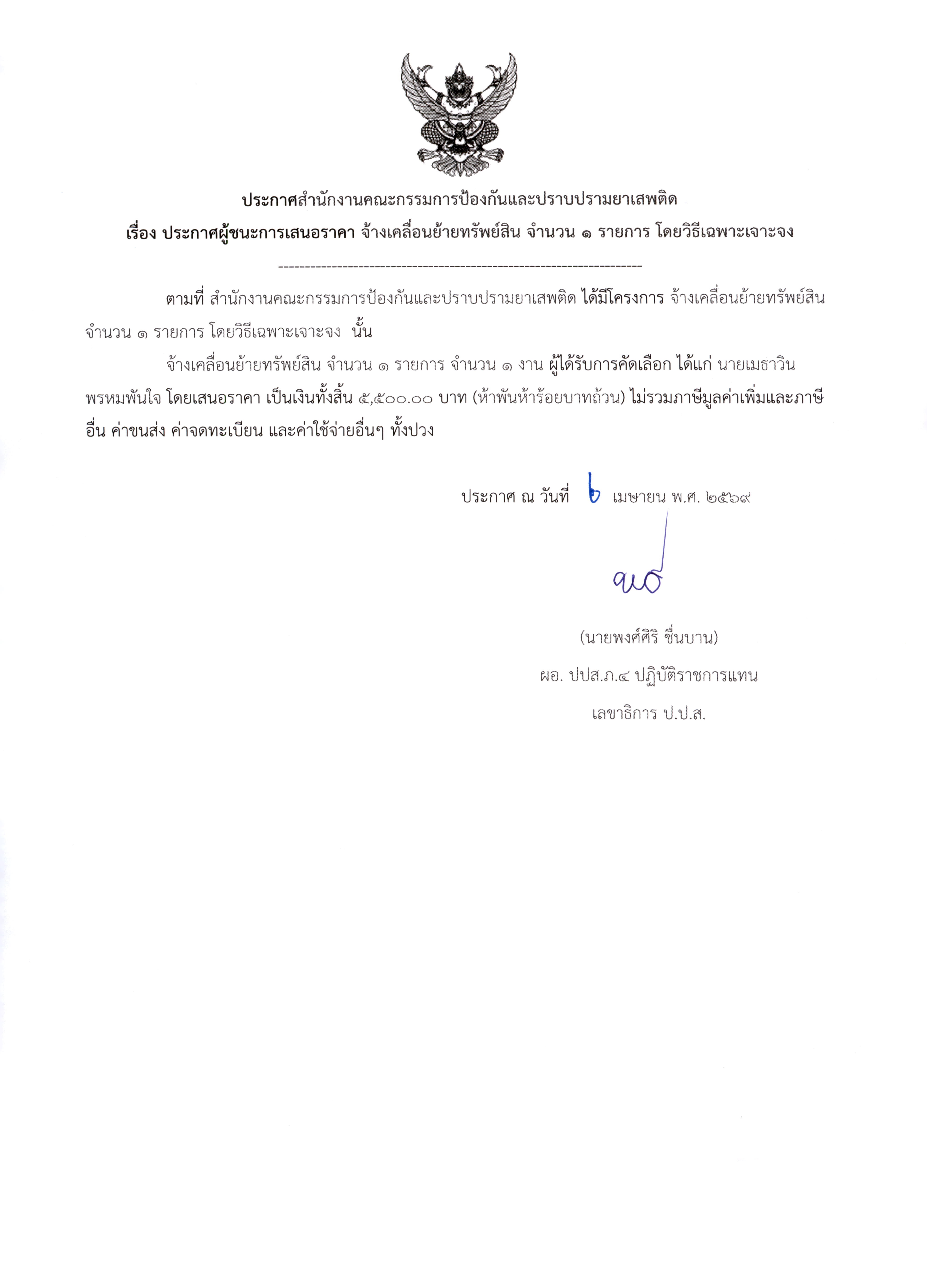 ปปส.ภ.๔ ประกาศผู้ชนะการเสนอราคา จ้างเคลื่อนย้ายทรัพย์สิน จำนวน ๑ รายการ โดยวิธีเฉพาะเจาะจง
